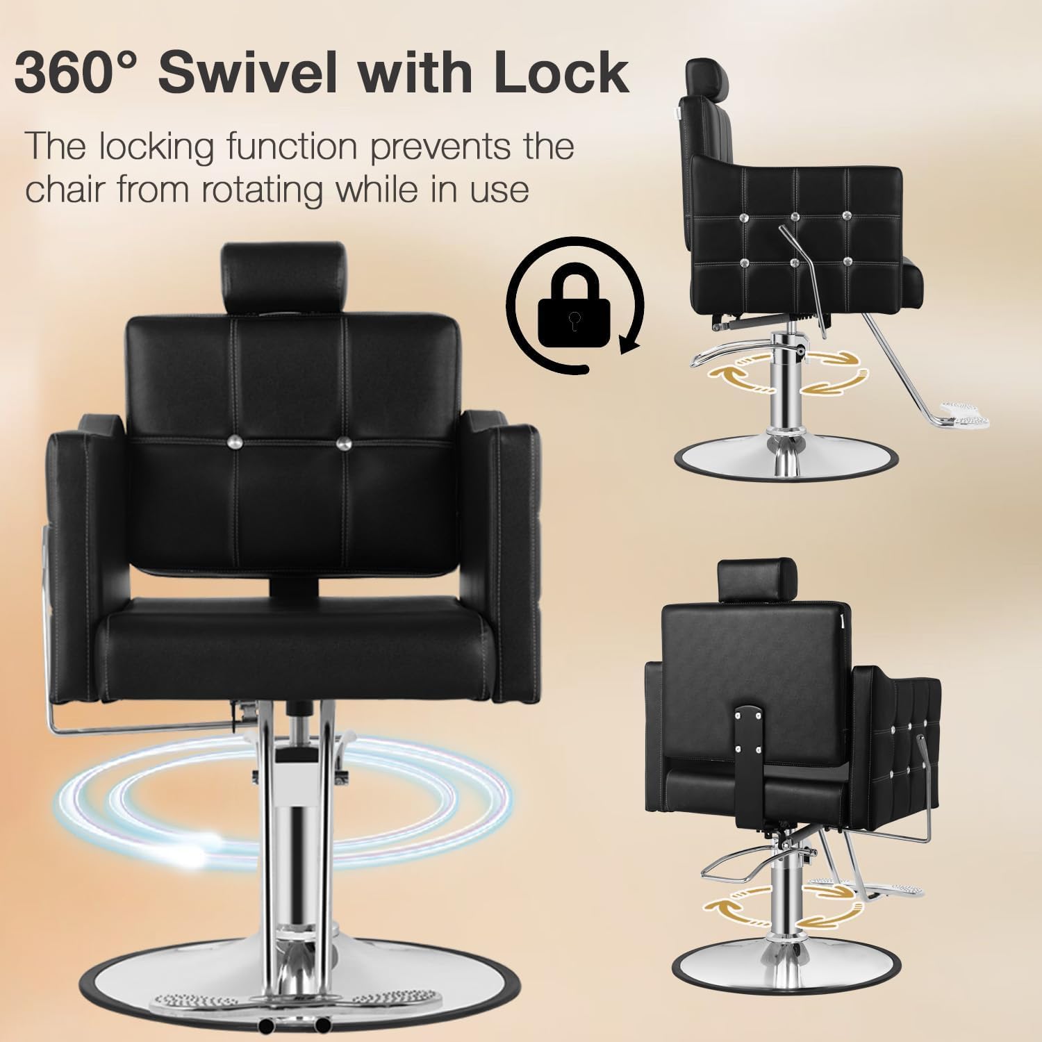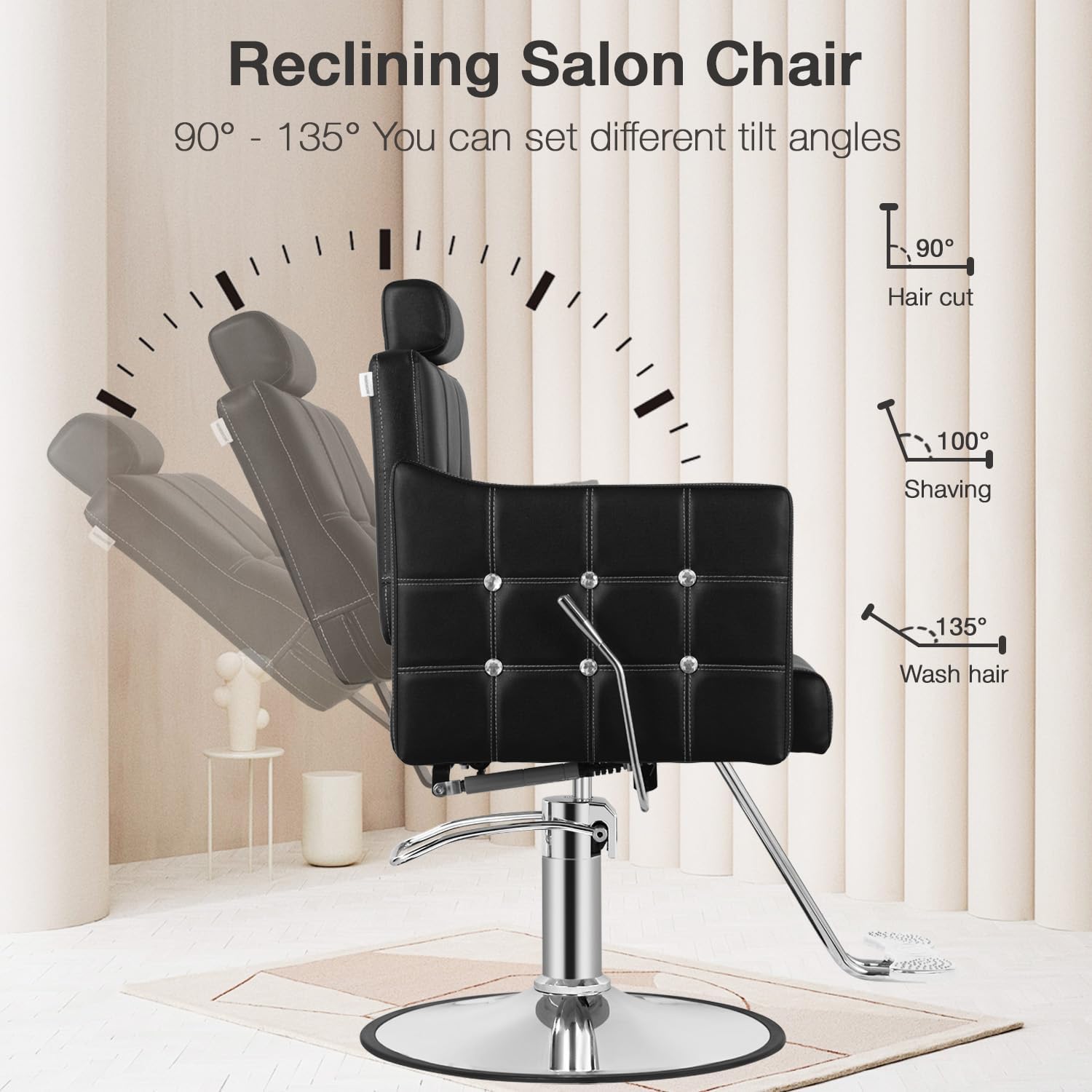 Black Reclining Salon Chair, Barber Chairs for Barbershop Home, Salon Chair for Hair Stylist, Styling Chairs Heavy Duty Hydraulic Pump, Adjustable Height & Removable Headrest, Crystal Button