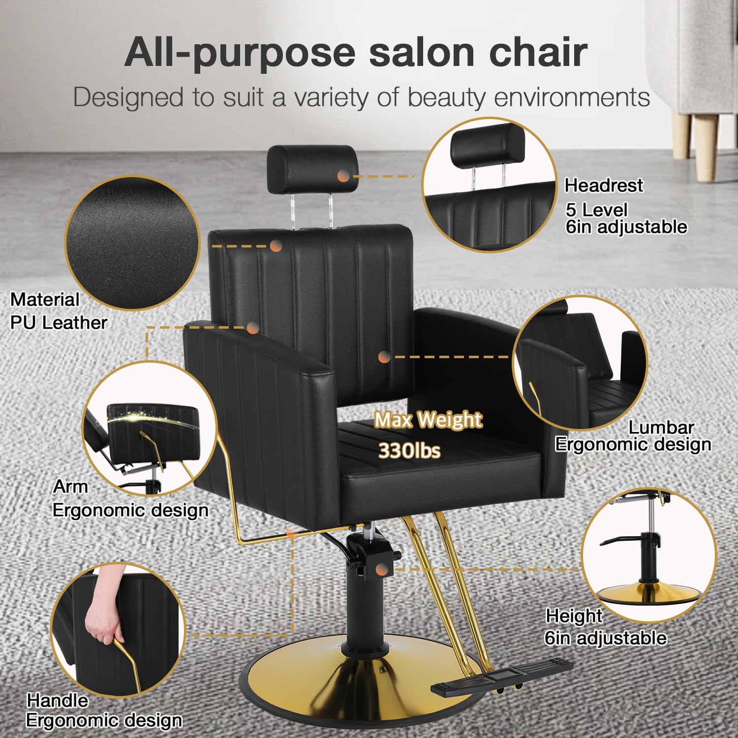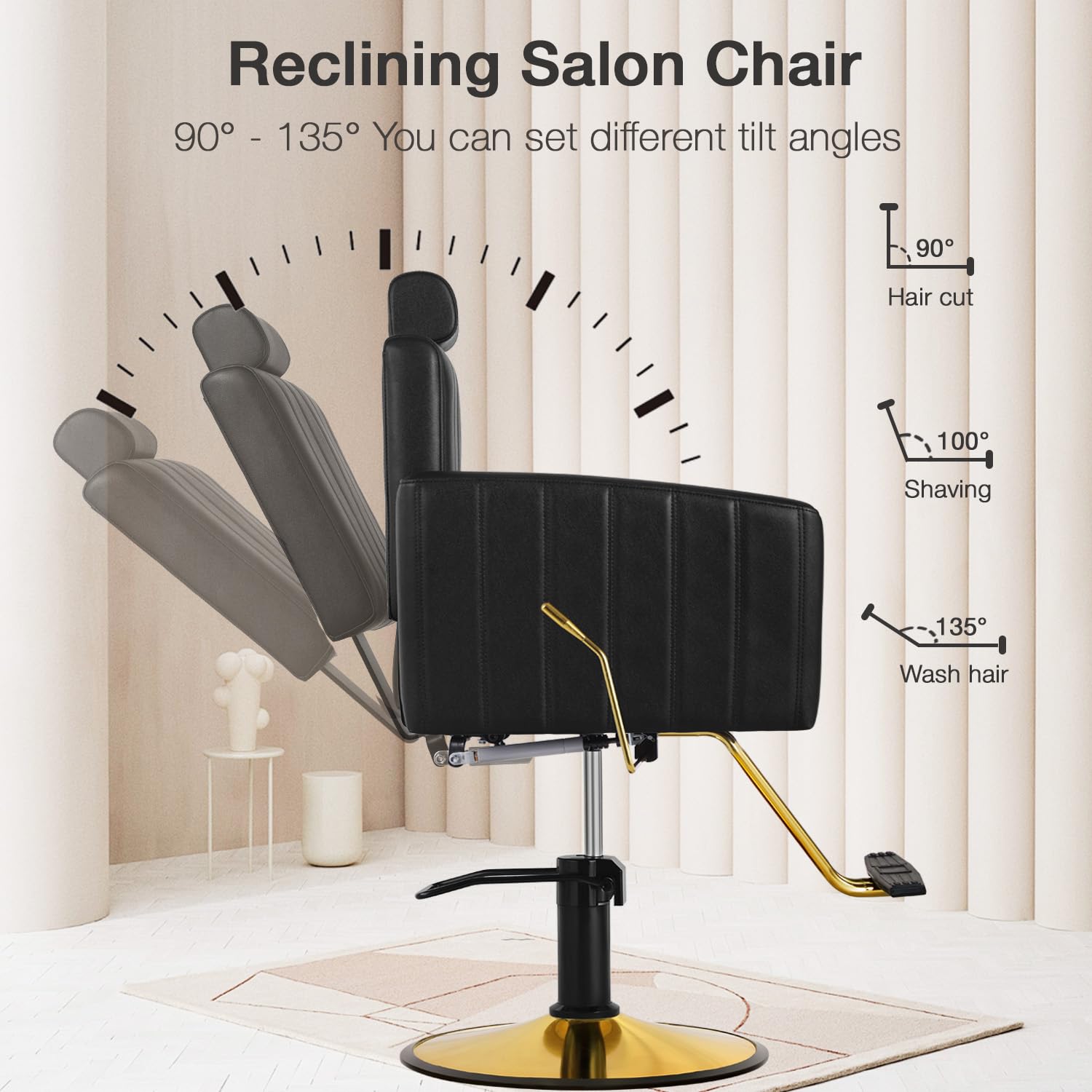Black Salon Chair for Hair Stylist, 90°-135° Reclining Barber Chair for Barbershop with Hydraulic Pump, 360° Swivel, Multi-Function Hair Styling Shampoo Chair Tattoo Chair Braiding Chair