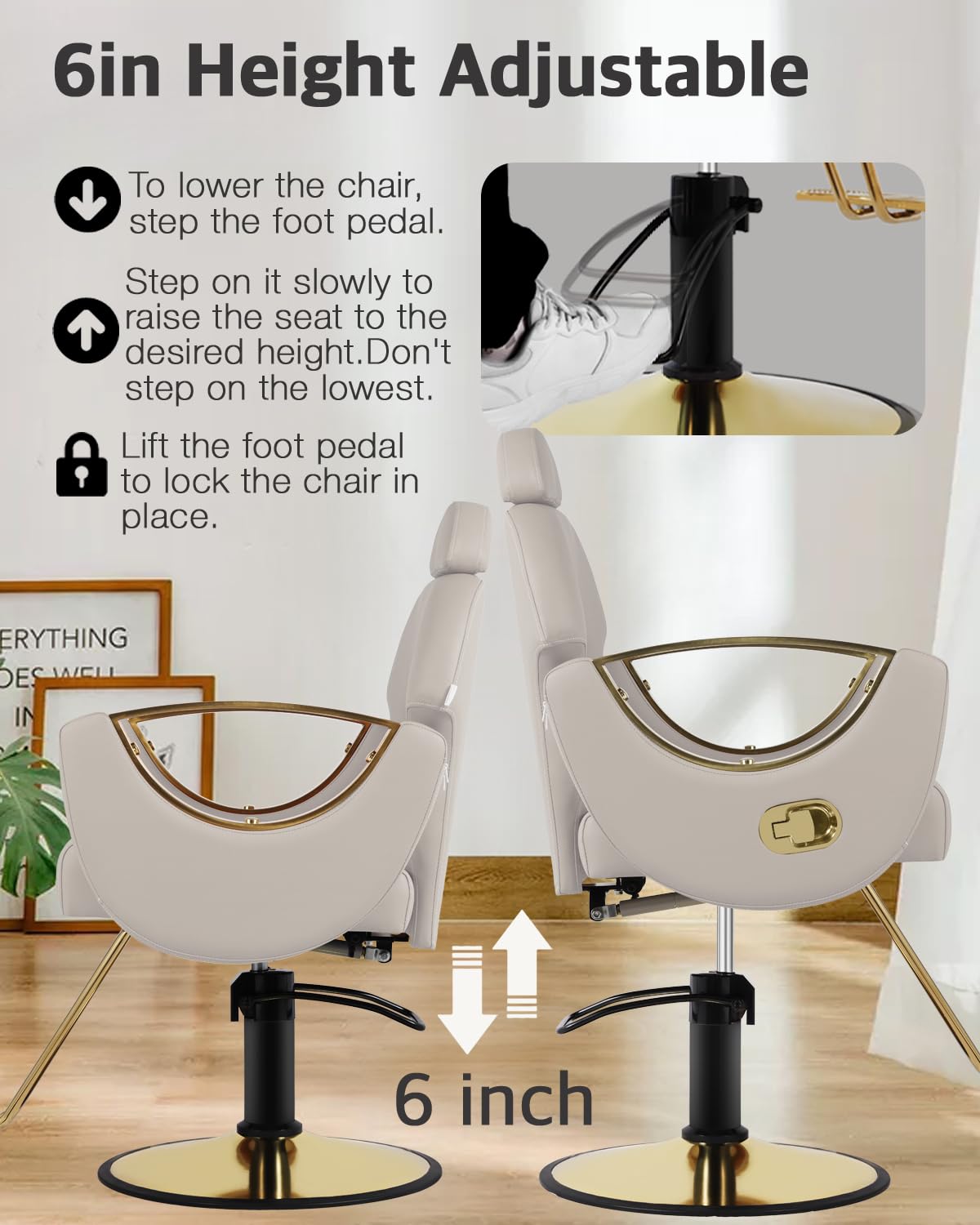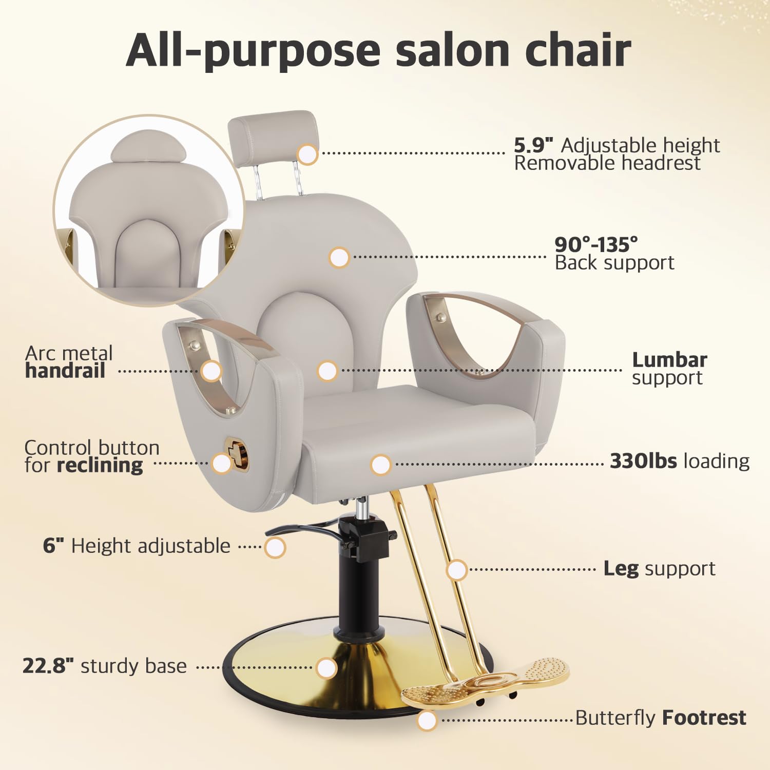 Salon Chair, Reclining Salon Chair for Hair Stylist, Barber Chair with Heavy Duty Hydraulic Pump, Hair Chairs Tattoo Braiding Beauty Spa Equipment, Light Gray Gold